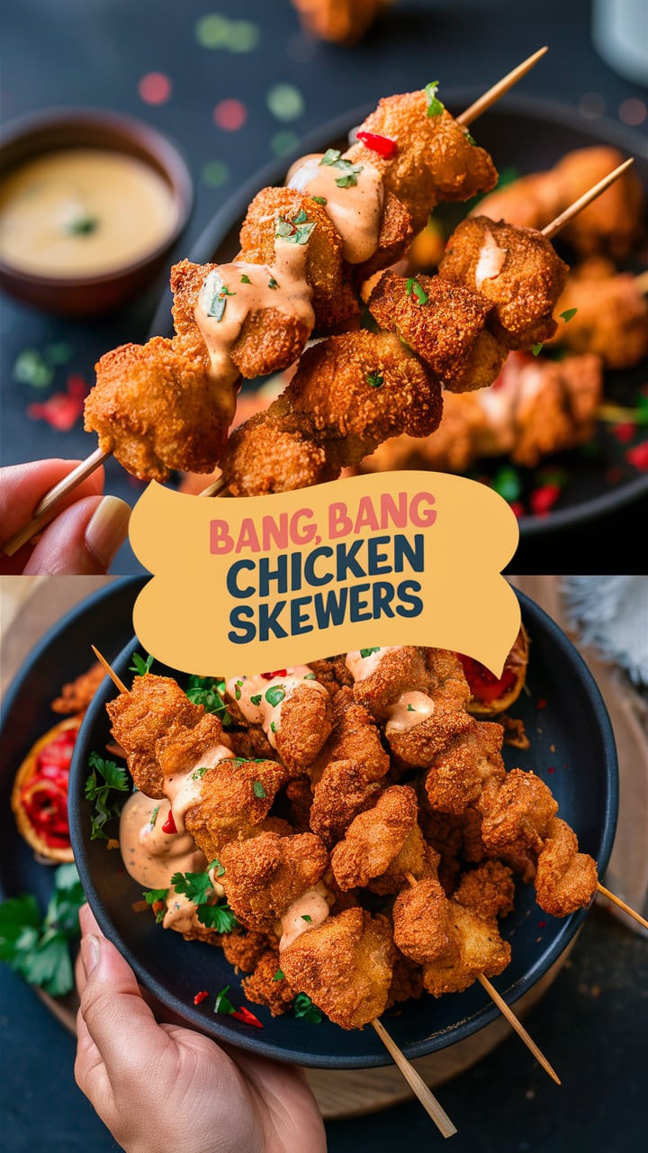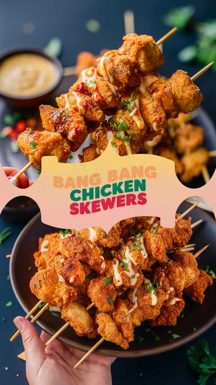 Bang Bang Chicken Skewers are grilled or cooked chicken pieces threaded onto skewers and coated with a signature Bang Bang sauce. The sauce is typically creamy with a balance of sweetness and heat, making it appealing to a wide range of taste preferences.