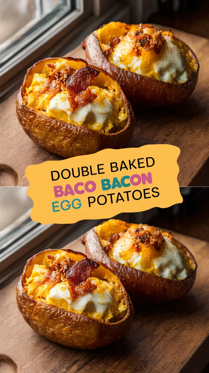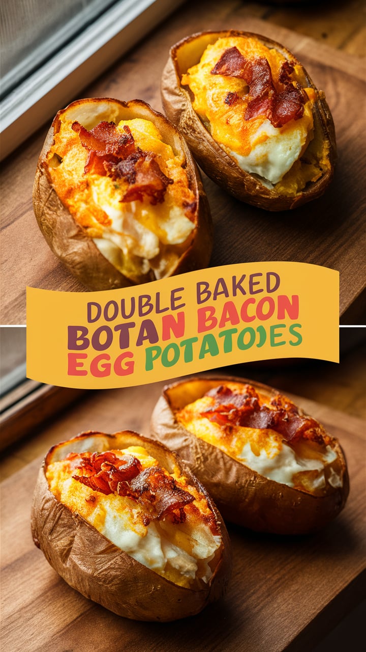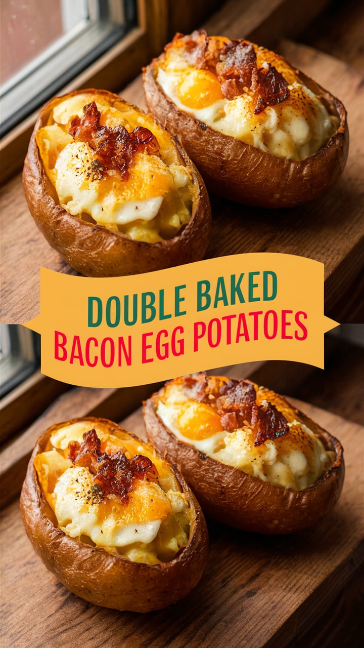 Double Baked Bacon Egg Potatoes are oven-baked potatoes that are cooked twice—first to soften the potato, and second after being filled with a rich mixture of bacon, eggs, cheese, and seasonings.