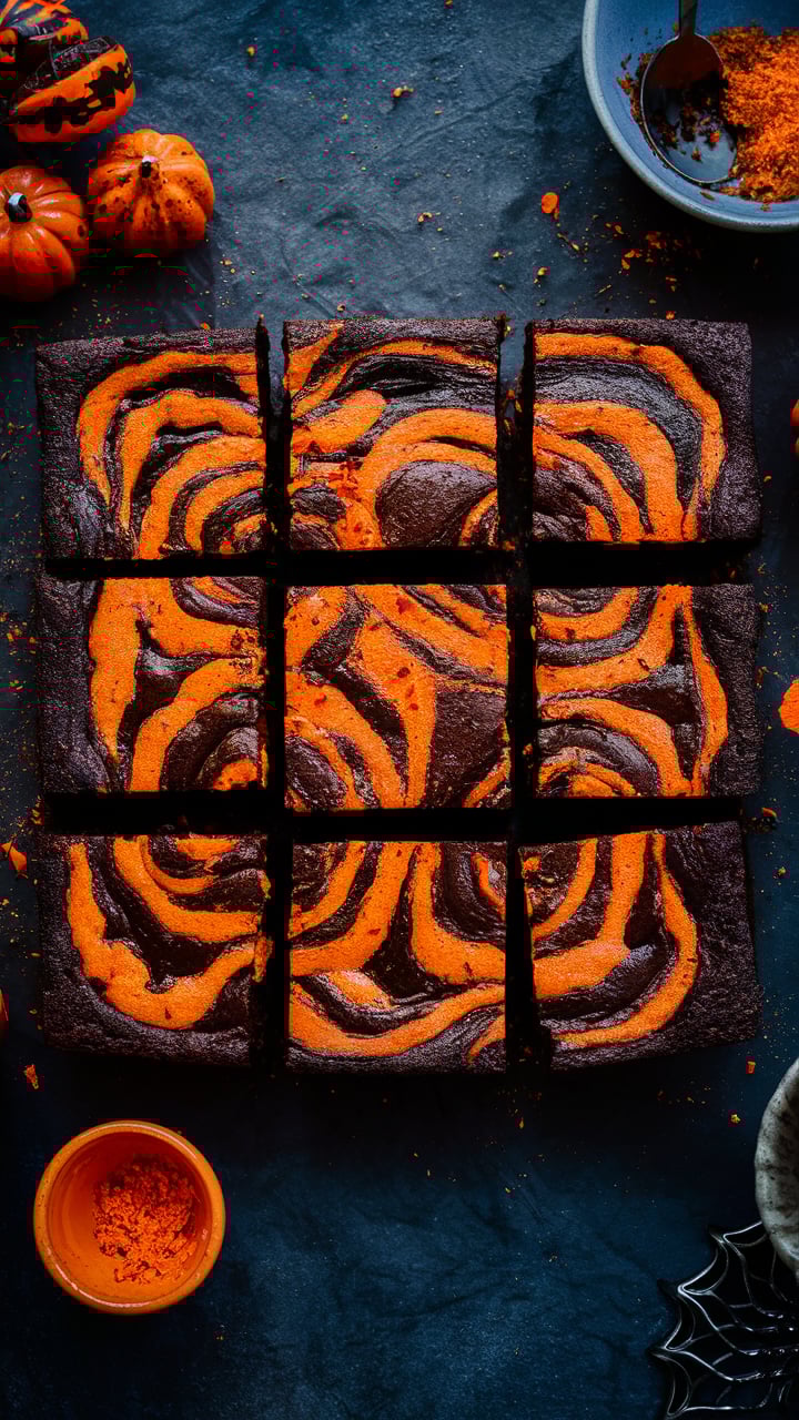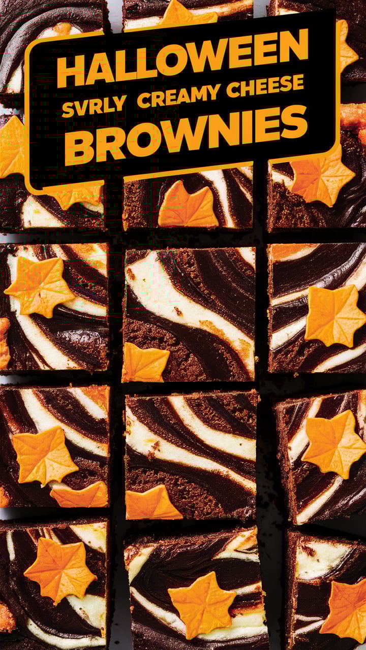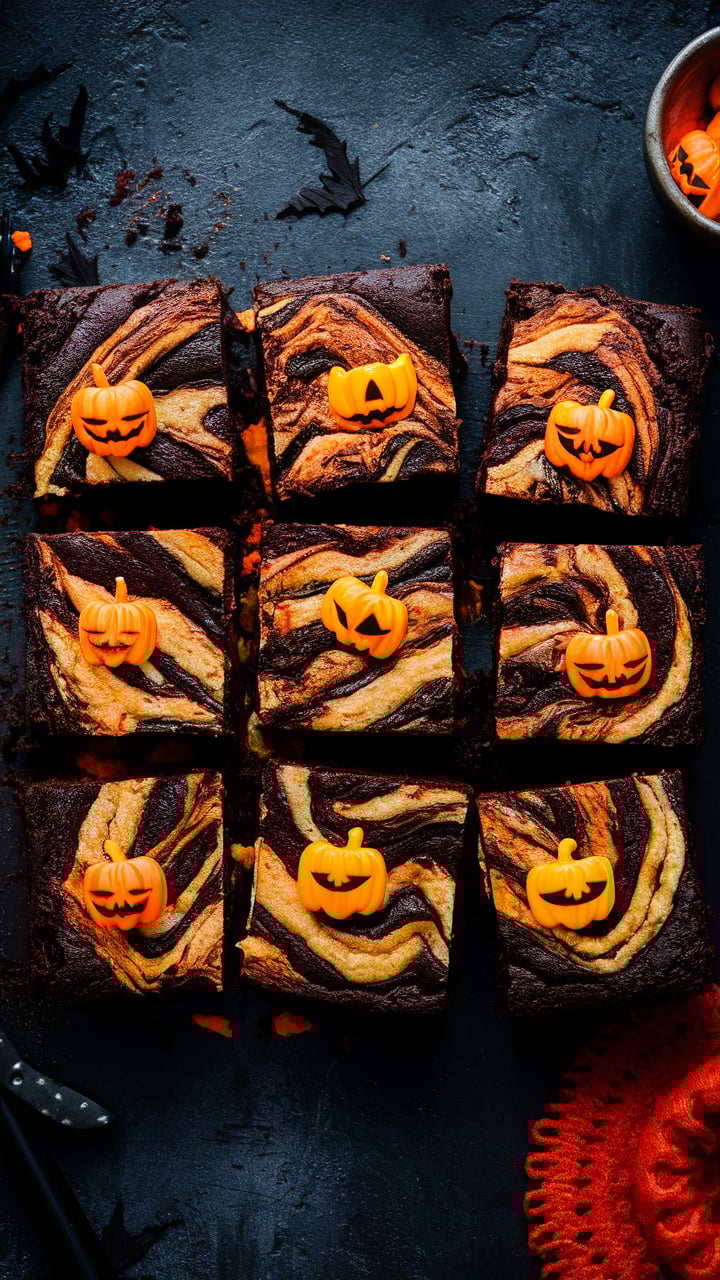 Deliciously fudgy brownies with spooky orange, black, and cream cheese swirls. Perfect for Halloween parties and festive gatherings.
