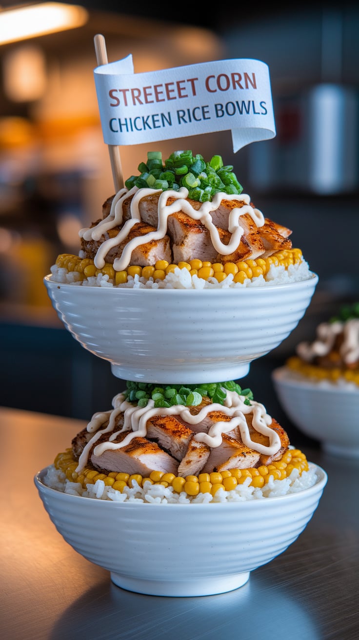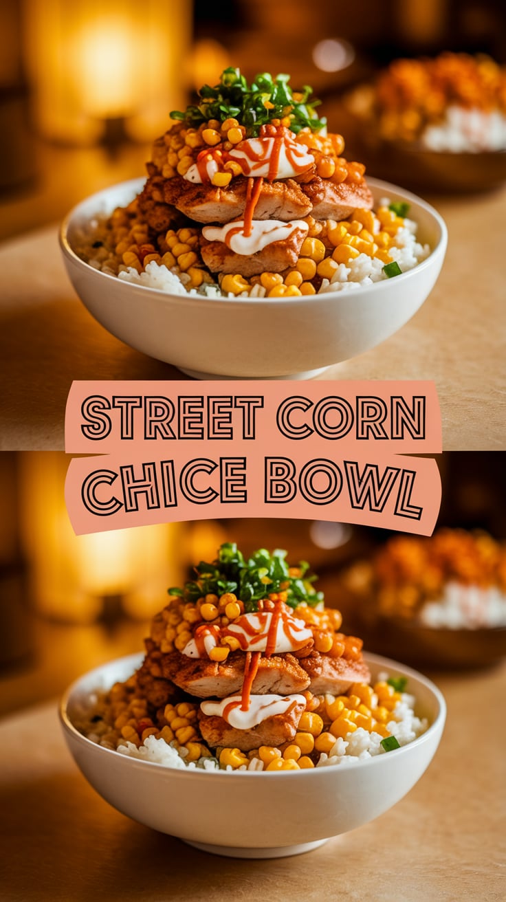 A Street Corn Chicken Rice Bowl is a modern bowl-style meal built on a base of fluffy rice, topped with seasoned chicken, sweet corn, fresh vegetables, and bold, zesty flavors inspired by Mexican street corn.